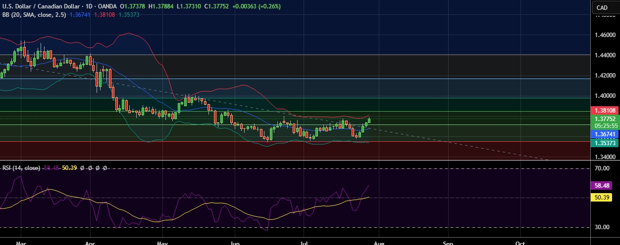 • Immediate resistance is located at 1.3804(Higher BB), any close above will push the pair towards 1.3843(50%fib).