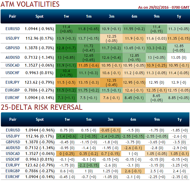 25 delta risk reversal for USDCAD has gradually been reducing its positive numbers (see negative numbers in brackets), just three months ago the hedging sentiments were to mitigate the upside risks, these positive numbers were at even higher levels.