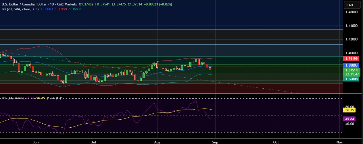 • Support is seen at 1.3708 (38.2%fib) and break below could take the pair towards 1.3679(Lower BB).