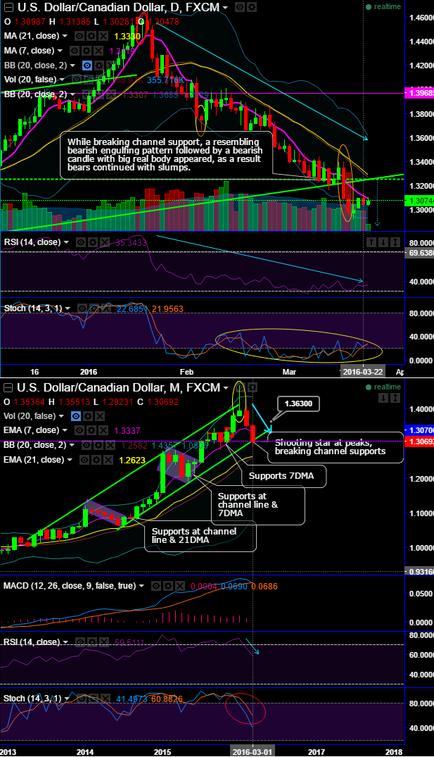 On a longer term perspective, shooting star candle pattern occurred at 1.3968 levels, the pair has dipped from the highs of 1.4689 levels to the current 1.3079 within a span of almost 3 months.