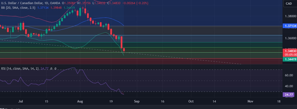 • Support is seen at 1.3468(23.6%fib) and break below could take the pair towards 1.3414(Lower BB).