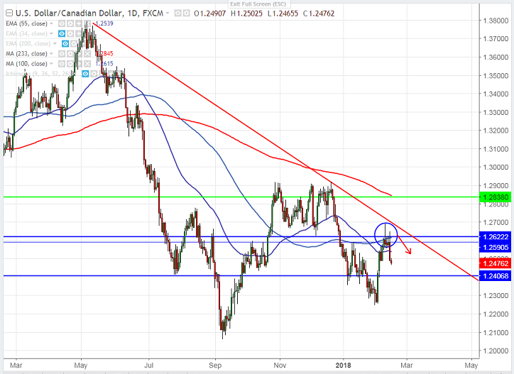 - USD/CAD declined almost 200 pips after hitting high of 1.26880. The pair hits intraday low of 1.24655. The decline in prices was due to sudden spike in crude oil prices and weakness in US equity markets. It is currently trading around 1.24744.