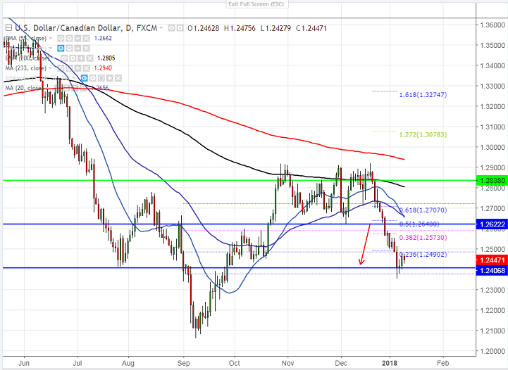 - CAD outperformed USD and enjoyed more than 150 pips rally in 2018. USD/CAD declined sharply after forming temporary top around 1.29202 on Dec 19th 2017. The main reason for the rally in Canadian dollar is due to better than expected Canadian jobs data and rising crude oil price. The pair hits low of 1.2355 and is currently trading around 1.24515.
