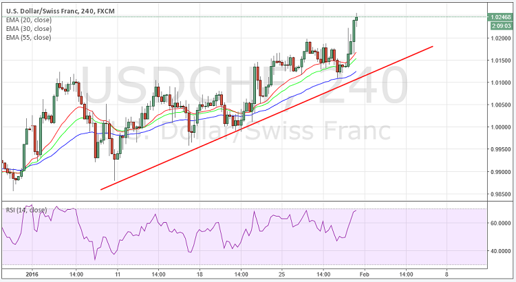 The USD/CHF rebounded from 1.0200 levels to hit high at 1.0241 levels, after the release US GDP data which came in line with the expectations at 0.7%. However, dollar gained strength on the day broadly due to unexpected negative interest rate decision by Bank of Japan.