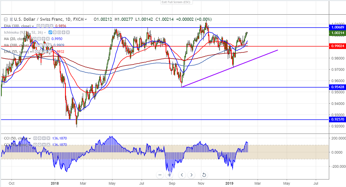 USDCHF is consolidate in narrow range between 1.000 and 1.00288 level for past two trading session. DXY has rebounded sharply more than 150 pips and broken major resistance 96.68 on account of broad based US dollar buying. But US and China trade talks and Brexit uncertainty are major factors which are expected to increase demand for safe haven assets .The pair hits intraday high 1.00240 and is currently trading around 1.00212.