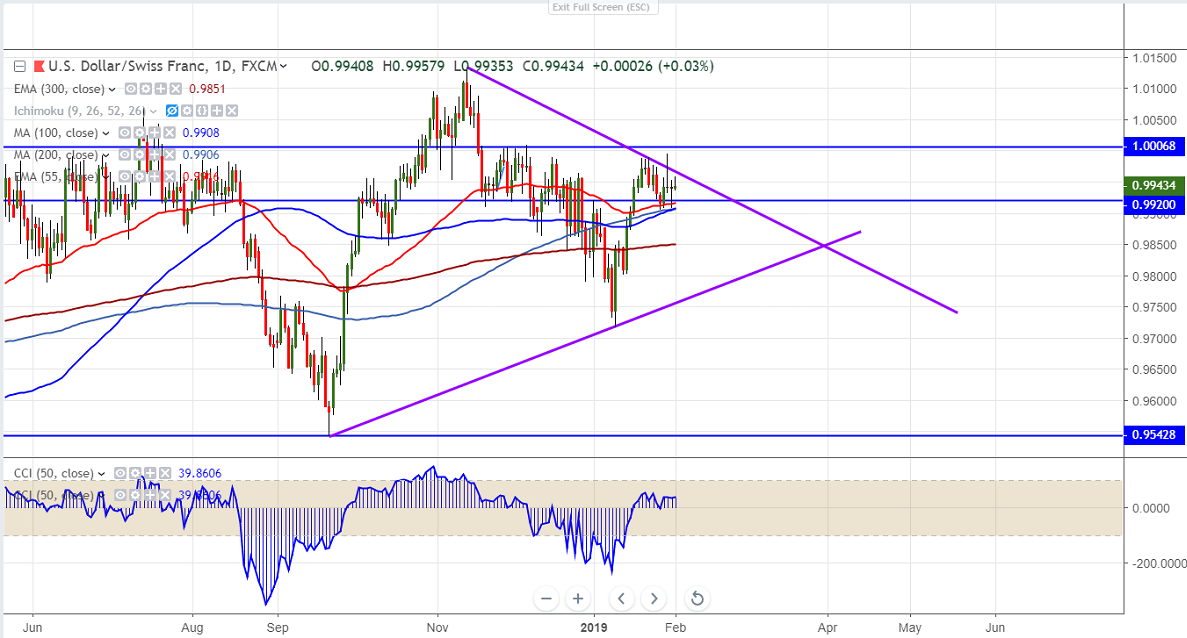 USD/CHF has once again recovered from low of 0.99075 and shown more than 50 pips jump. The pair is struggling to break above parity level 1.000.It hits intraday high of 0.99587 and started to decline.The pair is trading narrow range but bias is on downside after Fed monetary policy.According Fedwatch tool highest probability of hike by Fed this year is at 9% 3Q19 and chance of rate cut is at 30% chance in Q1 2020. US-China trade talks and Brexit uncertainty also supports Swiss franc. The pair is currently trading around 0.99233.