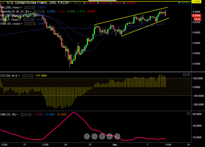 - USD/CHF has retreated till 0.9775 at the time of writing after making a high of 0.98237. Overall trend is still bullish as long as channel support 0.9720 holds.
