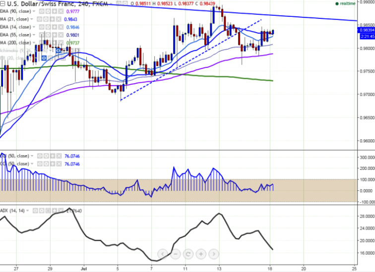 - The pair has taken support near 90 day EMA and slightly jumped from that level. It is currently trading around 0.98325.