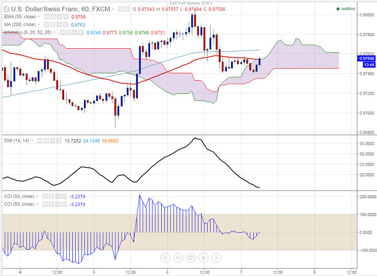 - USD/CHF has declined sharply after making a high of 0.98057.It is currently trading at 0.97514. Short term decline from 0.9960 till 0.9512 will come to end if the pair closes well above 0.9840.