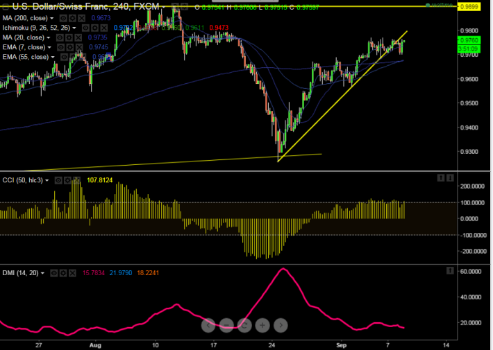 - USD/CHF has retreated till 0.97074 after making a high of 0.9770. Overall trend is still bullish as long as support 0.9680 holds.