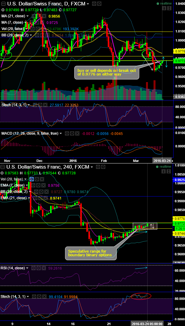 On daily charts, one can see prices can go either way upon make or break of 0.9776 on a closing basis.