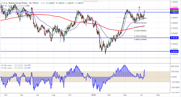 - USD/CHF has shown a good jump of more than 150 pips after hitting low of 0.98530 (Jul 9th 2018 low). The pair hits high of 0.99946 at the time of writing. The pair has formed almost a triple top near 1.000 level and any break above confirms minor trend reversal. The safe haven assets like yen ,Swiss franc and gold lost appeal amid escalating trade war between US and major economies especially with China .It is currently trading around 1.00635.