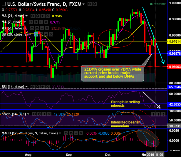 After bulls losing momentum in the pair yesterday at the highs of 0.9789, prices tumble today of US elections whereby Trump almost in the leading the contest.