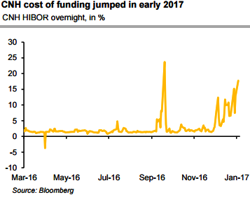 What occurred at the start of 2017 evokes the market anarchy in early 2016. This morning, Chinese offshore currency (CNH) overnight HIBOR spiked to 18.5%, a signal that China’s currency is under great pressure again. Liquidity tightening is a typical phenomenon when the currency is facing huge sell-off pressure – people borrow one currency and short, which pushes up the cost of funding.