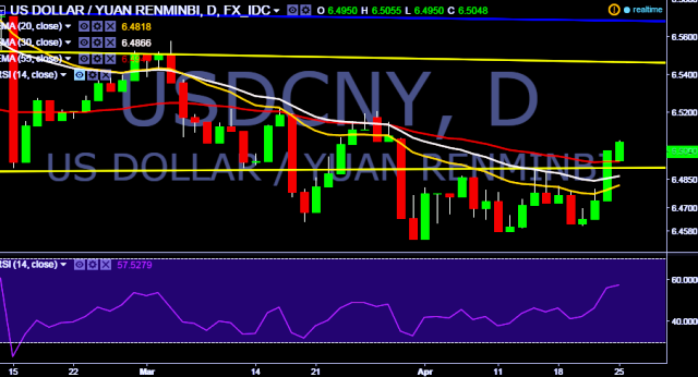 We prefer to take long position in USD/CNY around 6.50, stop loss 6.4910 and target 6.5184/ 6.5525 levels.