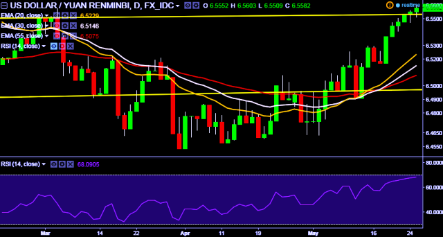 - A sustained close above 6.56 marks will test key resistance at 6.5708(50D EMA), 6.5790 levels respectively.