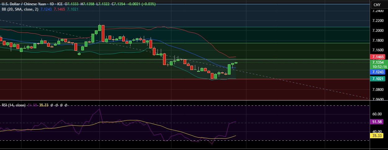 • Immediate resistance is located at 7.141 (38.2%fib), any close above will push the pair towards 7.146(Higher BB).