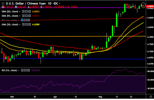 - Intraday bias remains bearish till the time pair holds key resistance at 6.92 mark.
