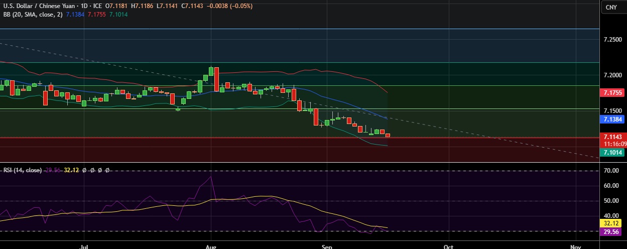 • At GMT 10:42, the dollar was down 0.04% to 7.115 against the Chinese Yuan.