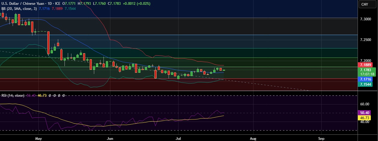• Immediate resistance is located at 7.185(38.2%fib), any close above will push the pair towards 7.189(Higher BB).
