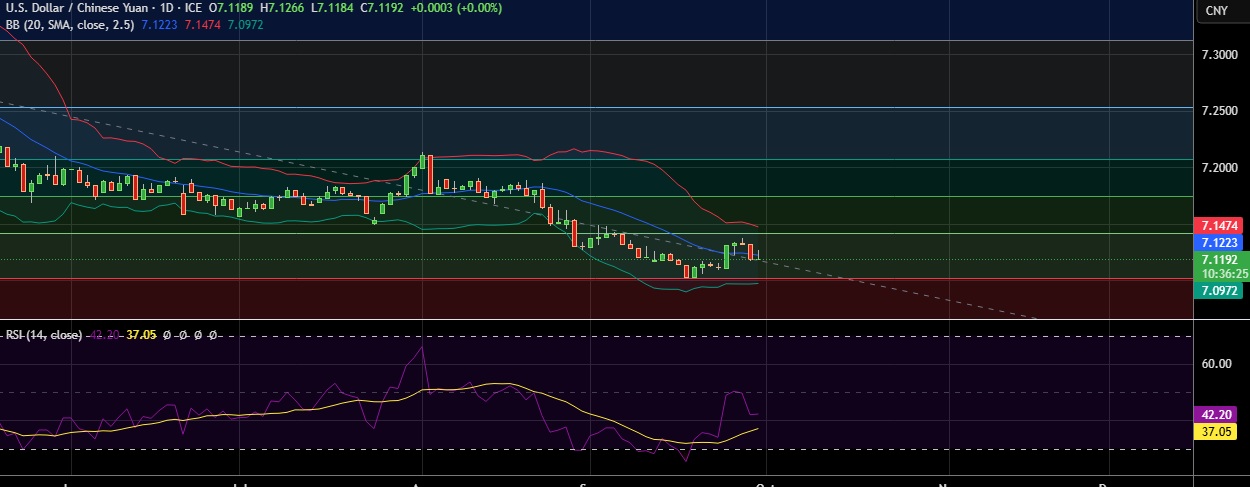 • Support is seen at 7.101(23.6%fib) and break below could take the pair towards 7.097(Lower BB).