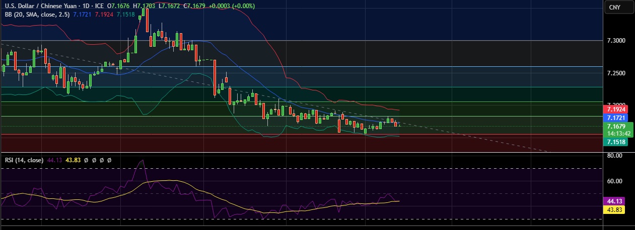 • Support is seen at 7.155(23.6%fib) and break below could take the pair towards 7.152 (Lower BB).