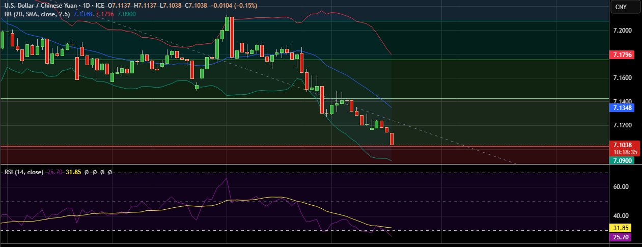 • Support is seen at 7.102(23.6%fib) and break below could take the pair towards 7.090 (Lower BB).