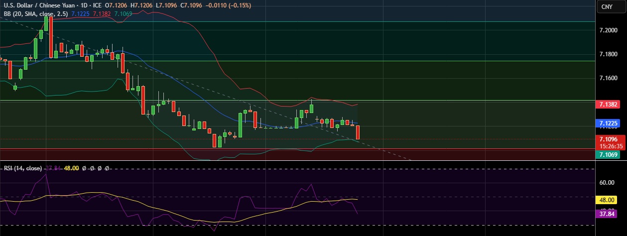 • Support is seen at 7.107(Lower BB) and break below could take the pair towards 7.101(23.6%fib).