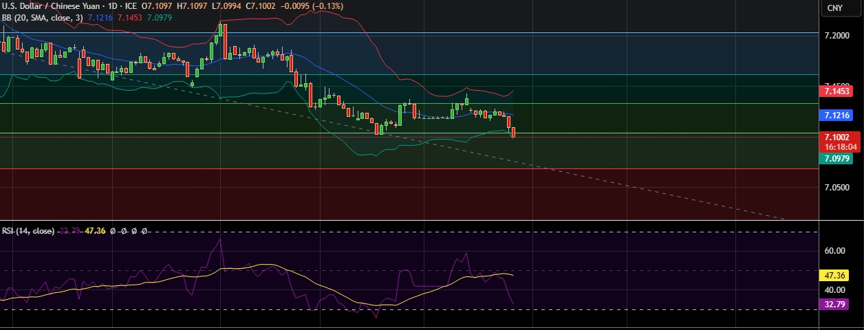 • Support is seen at 7.078(Lower BB) and break below could take the pair towards 7.086(Nov 4th 2024 low).