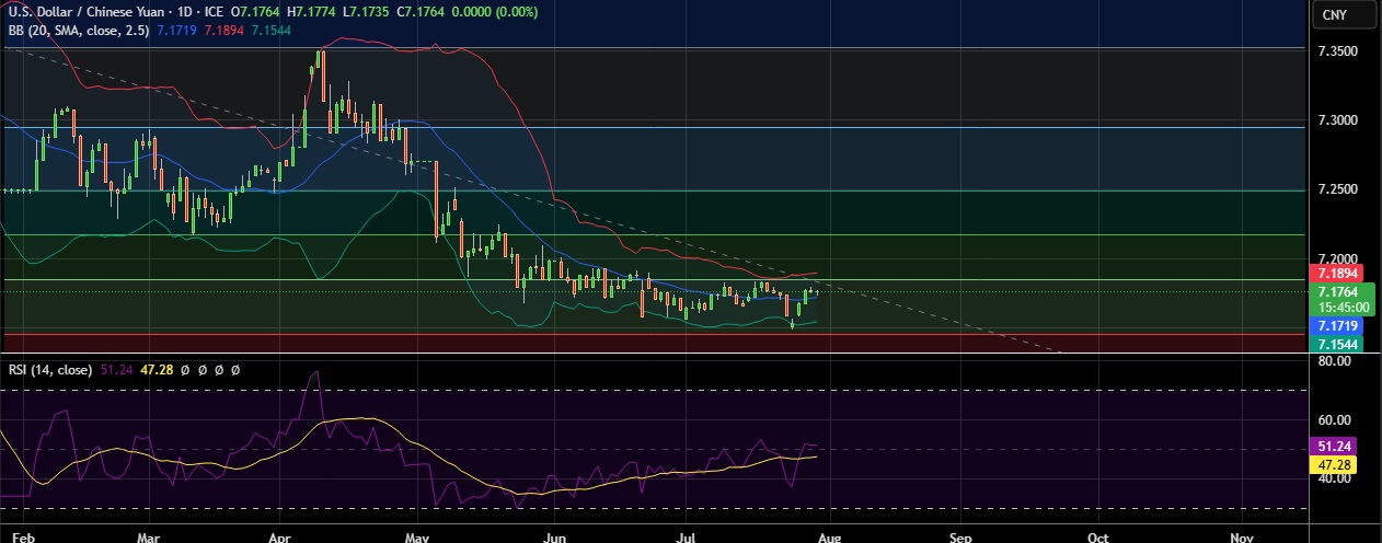 • Support is seen at 7.171(SMA 20) and break below could take the pair towards 7.155 (Lower BB).