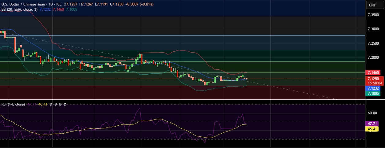 • Support is seen at 7.123(SMA 20) and break below could take the pair towards 7.104(Lower BB).