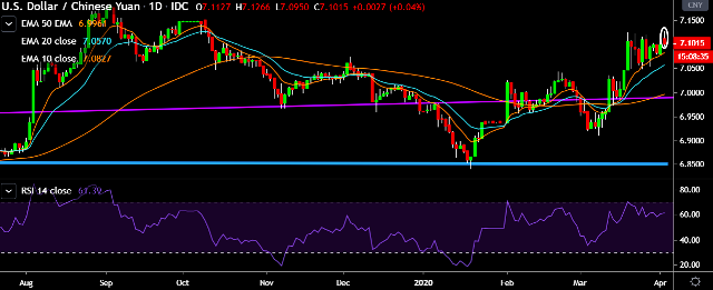 We prefer to take long position in USD/CNY around 7.10, stop loss at 7.0790 and target of 7.1515.