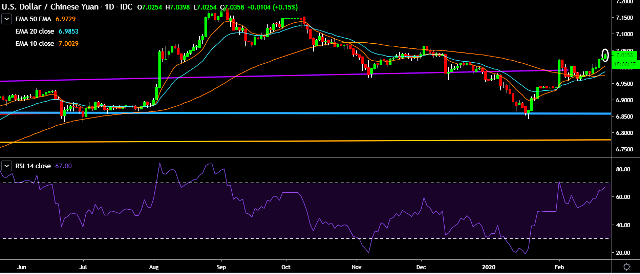 We prefer to take long position on USD/CNY around 7.03, stop loss at 7.00 and target of 7.0552.