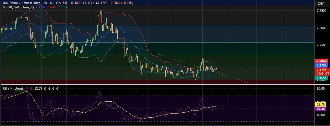 • Support is seen at 7.167(Daily low) and break below could take the pair towards 7.156 (Lower BB).