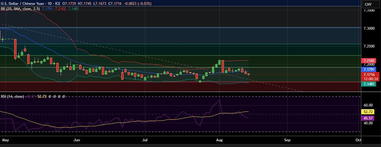 • Support is seen at 7.179(SMA 20) and break below could take the pair towards 7.155 (Lower BB).