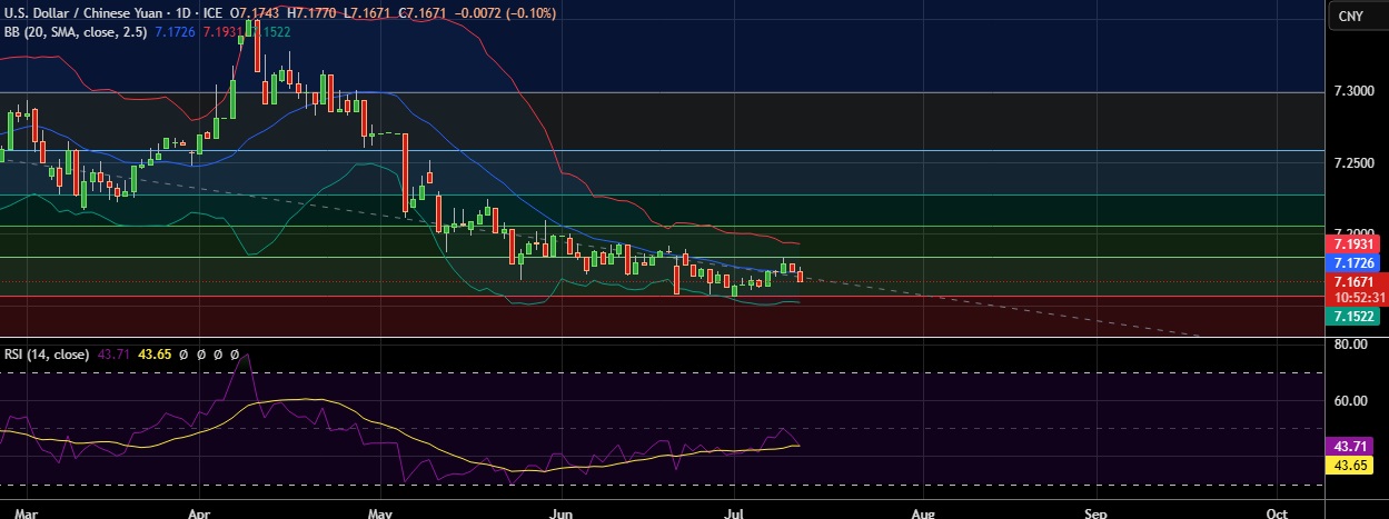 • Support is seen at 7.156(23.6%fib) and break below could take the pair towards 7.152 (Lower BB).