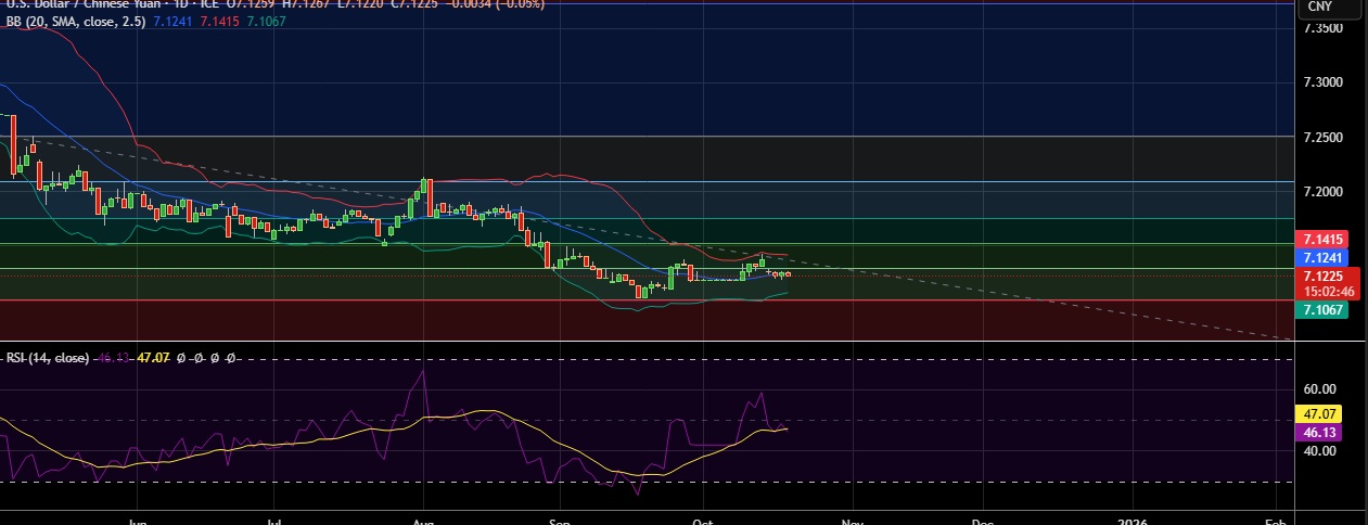 • Support is seen at 7.107(Lower BB) and break below could take the pair towards 7.100(23.6%fib).