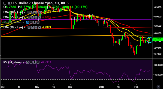 We prefer to take long position on USD/CNY around 6.7700, stop loss at 6.7510 and target of 6.8000.