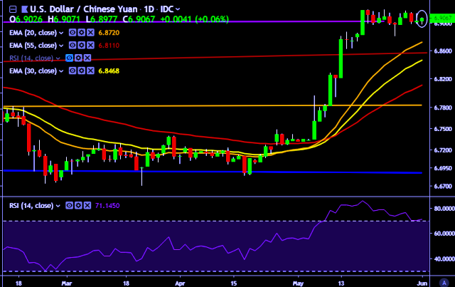 - USD/CNY is currently trading around 6.9050 marks.