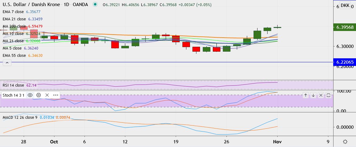 - USD/DKK is trading 0.05 percent higher at 6.3960, having hit high of 6.4065 earlier, its highest since September 28.