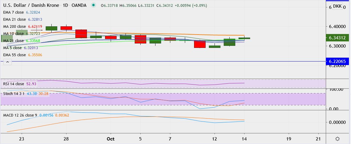 - USD/DKK is trading 0.1 percent higher at 6.3448, having hit high of 6.3449 earlier, its highest since October 5.