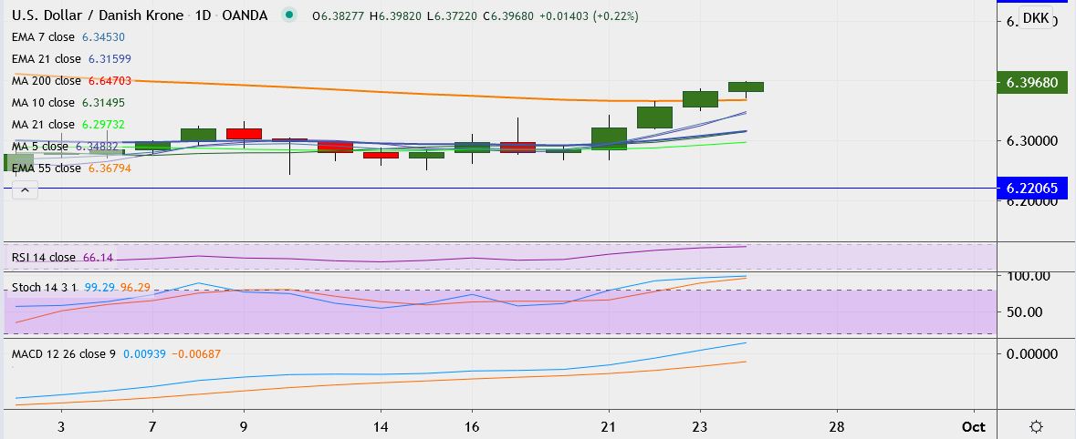 FxWirePro: USD/DKK at 2-month peak, finds minor support at 55-EMA