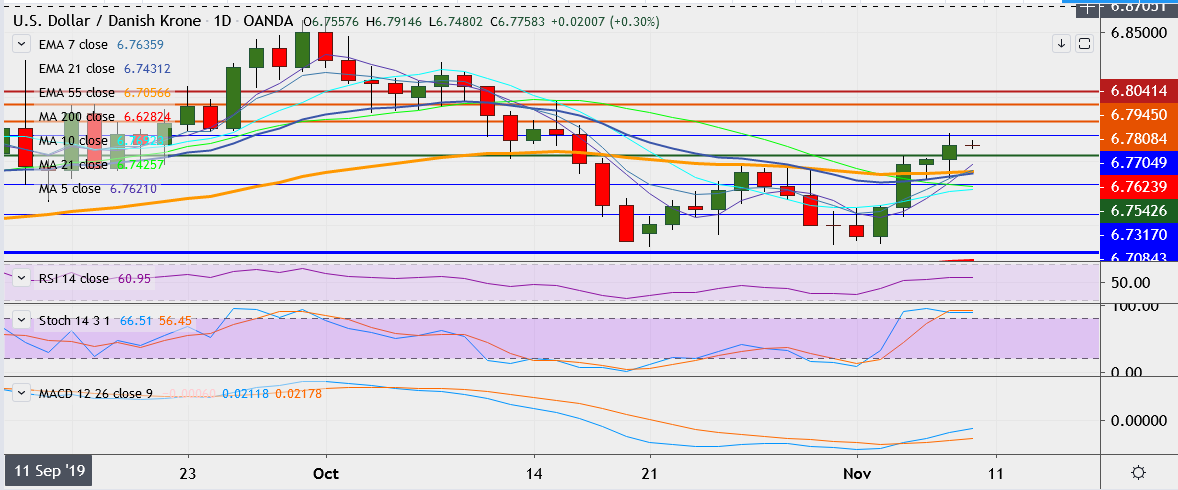 - USD/DKK is currently trading flat at 6.7637, having hit high of 6.7718 on Thursday, its highest since October 16.