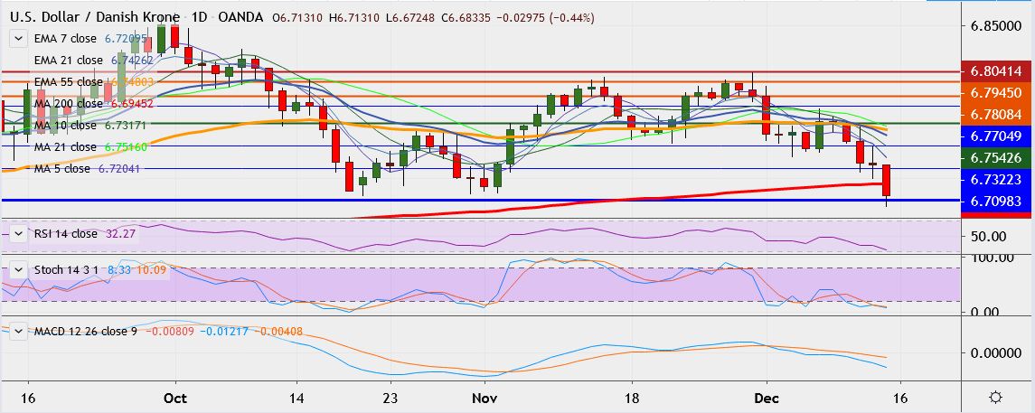 - USD/DKK is currently trading 0.4 percent down at 6.6860, having hit low of 6.6724 earlier, its lowest since August 14.