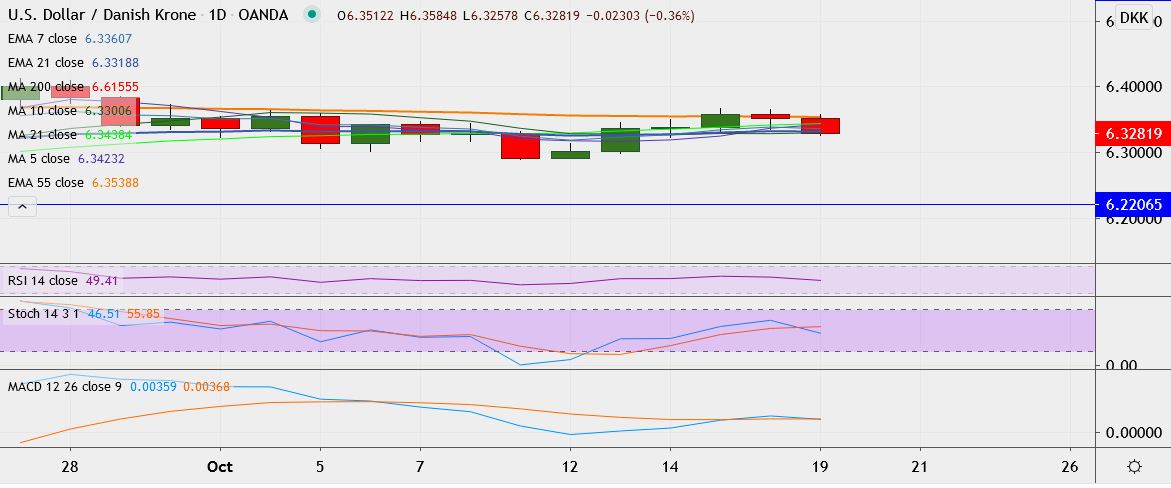 - USD/DKK is trading 0.4 percent lower at 6.3284, having hit high of 6.3675 on Thursday, its highest since September 30.
