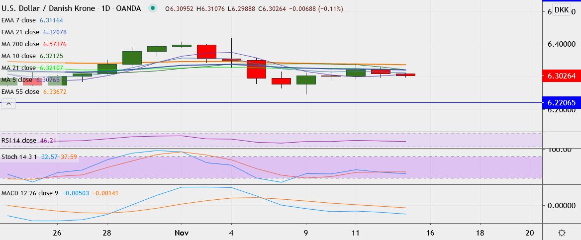 - USD/DKK is trading 0.1 percent lower at 6.3000, having hit high of 6.3385 on Wednesday, its highest since November 5.
