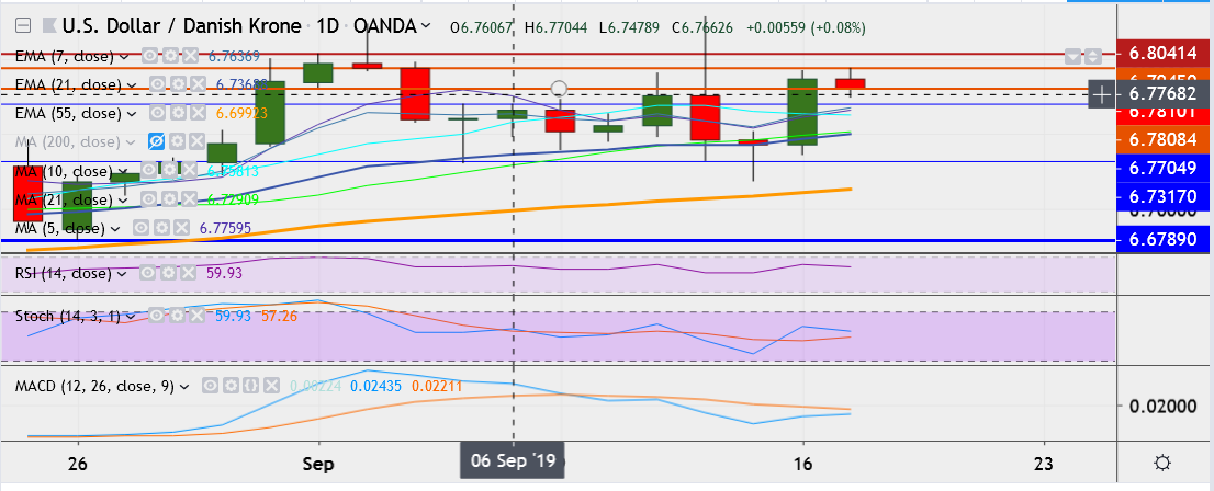 - USD/DKK is currently trading 0.1 percent down at 6.7822, having hit a high of 6.8287 on Thursday, its highest since May 2017.