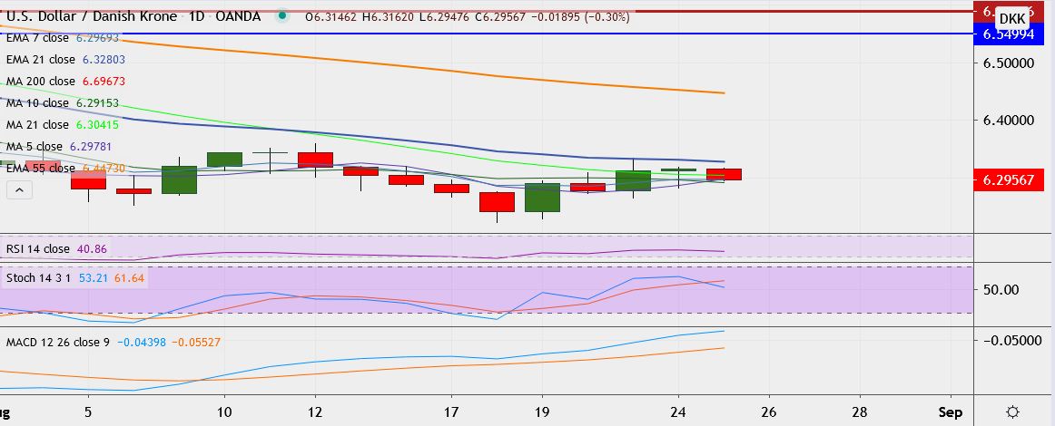 - USD/DKK is trading 0.3 percent lower at 6.2969, having hit high of 6.3344 on Friday, its highest since August 12.