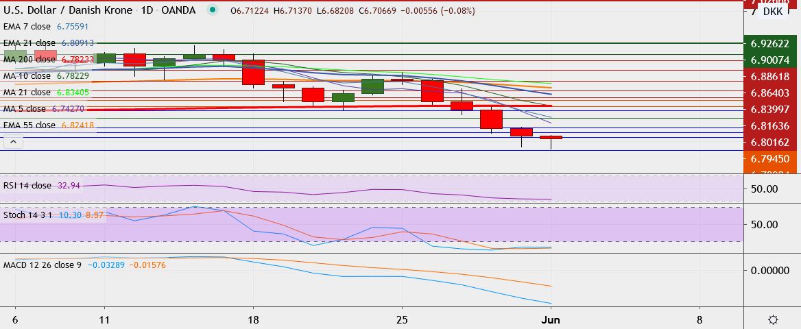 - USD/DKK is trading 0.2 percent down at 6.7002, having hit low of 6.6820 earlier, its lowest since March 16.