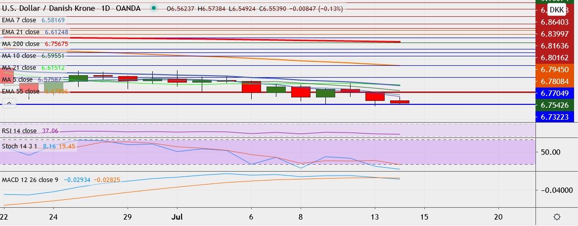 - USD/DKK is trading 0.1 down at 6.5552, having hit low of 6.5442 the day before, its lowest since June 11.